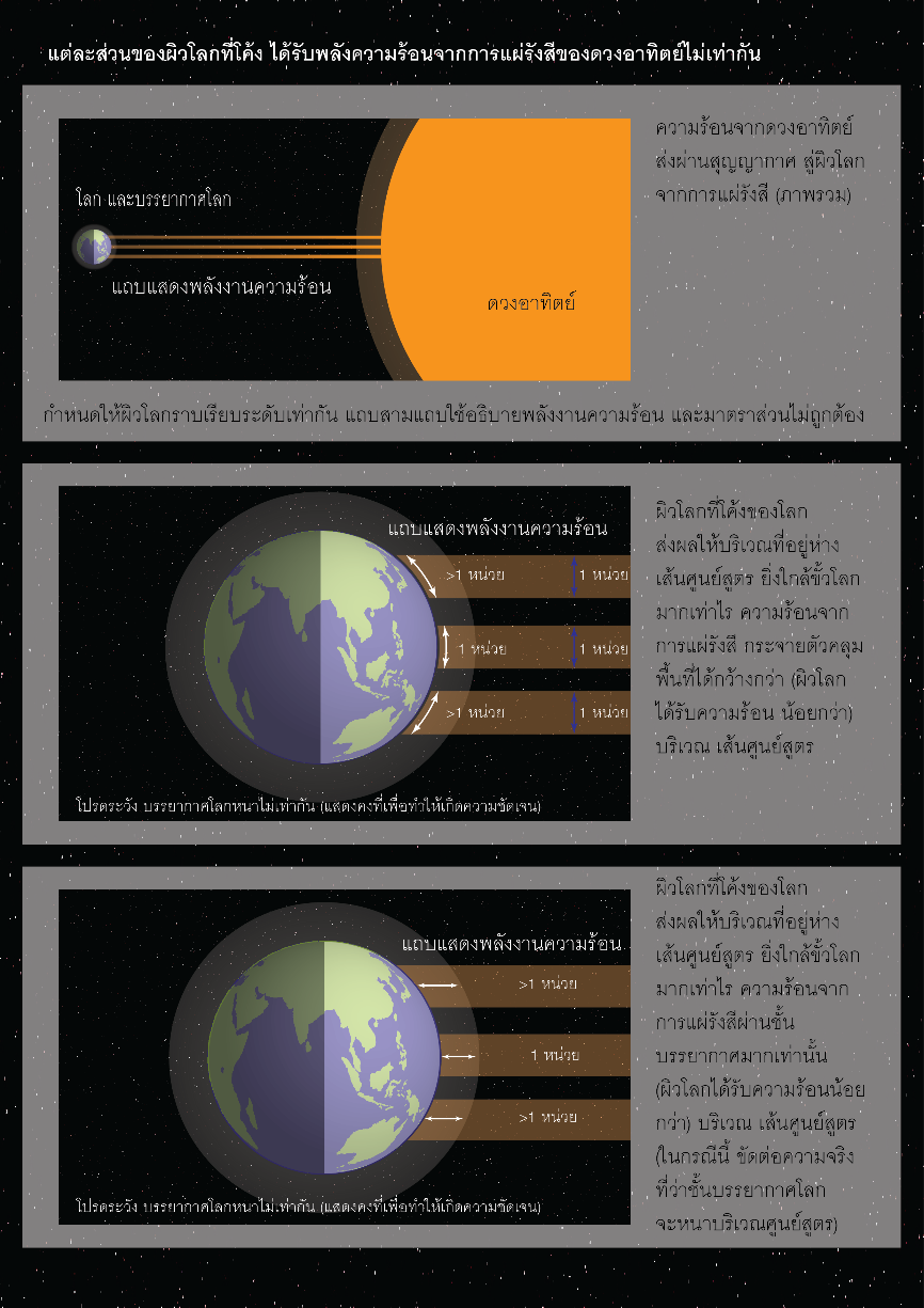 พลังงานความร้อนจากดวงอาทิตย์ ทำให้ผิวโลกร้อนขึ้น แต่ในแต่ละบริเวณของโลก ผิวโลกจะได้รับความร้อนไม่เท่ากัน (ภาพ 2.3) เนื่องจากชั้นบรรยากาศโลก หนาไม่เท่ากัน โดยบริเวณศูนย์สูตรจะมีความหนามากกว่าบริเวณขั้นโลก แต่ที่แสดงในภาพกำหนดให้คงที่ เพื่อให้ง่ายในการพิจารณาแยกประเด็น