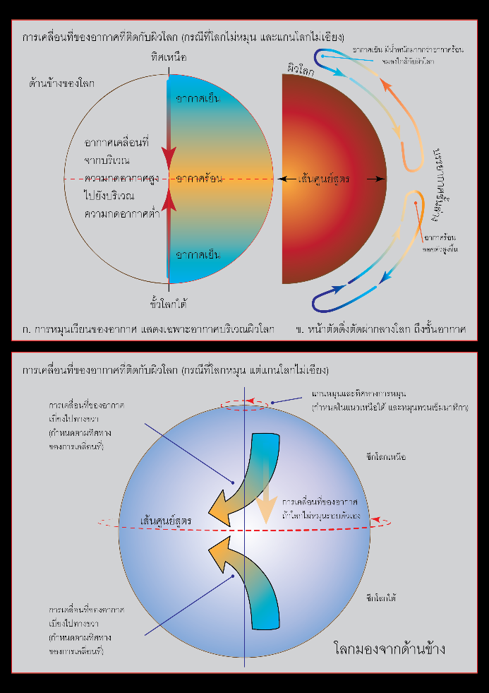 ภาพ 2.4: (ก) การเคลื่อนที่ของมวลอากาศ ในกรณีที่โลกไม่หมุนรอบตัวเอง (ข) ผลของแรงคอริออลิส ทำให้มวลอากาศเคลื่อนที่เบี่ยงจากทิศทางที่ควรเคลื่อนที่จากบริเวณเส้นศูนย์สูตรไปยังขั้วโลก