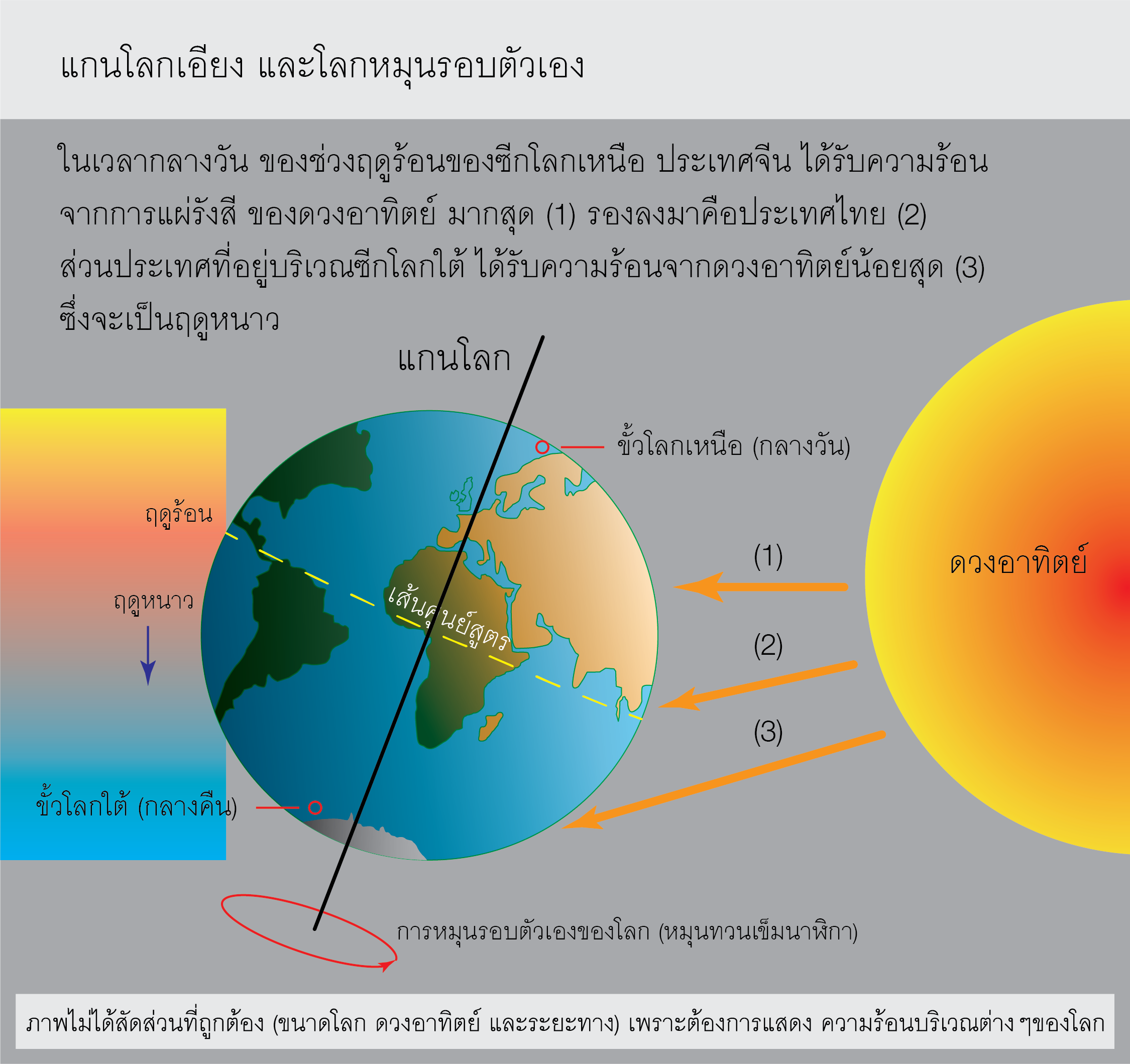 ภาพ 2.5: แกนหมุนของโลกที่เอียงส่งผลการได้รับความร้อนจากดวงอาทิตย์ ไม่สม่ำเสมอทั้งปี แต่มีรูปแบบที่ซ้ำเดิม เกิดเป็นฤดูของพื้นที่ต่างๆ บริเวณผิวโลก