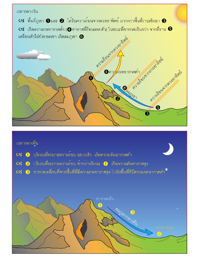 ลักษณะความสูงต่ำ และความลาดชันของพื้นที่ ส่งผลต่อการได้รับปริมาณความร้อน ที่ได้จากการแผ่รังสีของดวงอาทิตย์ (ภาพ 2.6) พื้นที่ลาดราบเชิงเขา ในช่วงกลางวันได้รับพลังงานความร้อนน้อยแต่กระจายในพื้นที่กว้างกว่า เมื่อเปรียบเทียบกับพื้นที่เขาบริเวณผาชัน ได้รับพลังงานความร้อนมากพื้นที่ลาดเขา เนื่องจากพื้นที่กระจายความร้อนน้อยกว่า ลักษณะดังกล่าว โดยทั่วไป ทำให้เกิดลมภูเขา พัดขึ้นบริเวณยอดเขาในเวลากลางวัน และเกิดลมเย็นภูเขาที่พัดจากยอดเขา สู่ที่ราบลาดเชิงเขาในเวลากลางคืน
