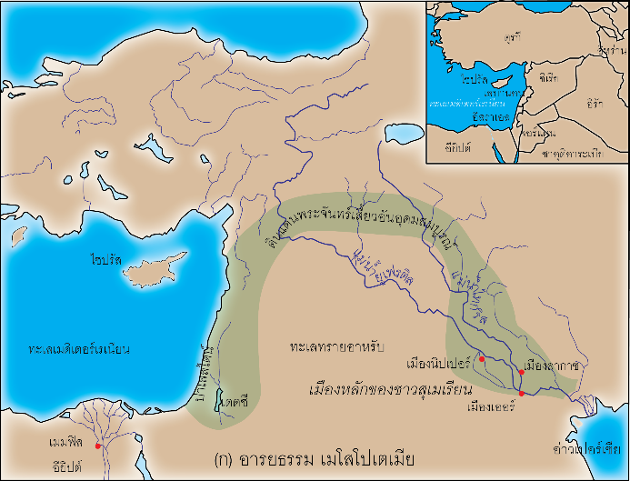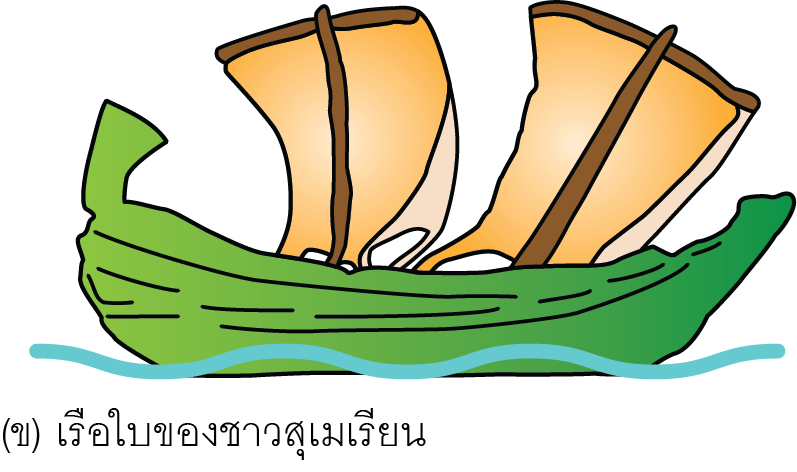 ภาพ 4.1: (ก) ที่ตั้งอารยธรรม เมโสโปเตเมีย บริเวณพื้นดินที่อุดมสมบูรณ์รูปพระจันทร์เสี้ยว ที่เกิดริมฝั่งแม่น้ำไทกริส และแม่น้ำยูเฟรทีส (ข) ภาพวาดจากดินเผารูปเรือใบ หลักฐานการใช้ประโยชน์จากลมเป็นครั้งแรกของมนุษย์