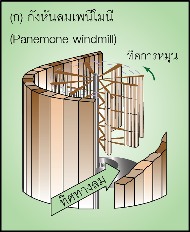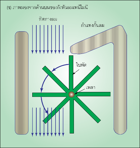 กังหันลมที่มีแกนหมุนในแนวดิ่งนี้ เป็นการหมุนจากแรงที่เกิดจากแรงต้านลมที่ที่ต่างกัน ของชุดพัดของใบครึ่งหนึ่งมาก และอีกครึ่งหนึ่งน้อย (ถูกบังไว้) ในภาพ 4.3 (ข) จะเห็นได้ว่า มีเพียงใบพัดจำนวนครึ่งหนึ่ง (4) ใบ ที่จะทำให้เกิดแรงหมุนนี้ แรงหมุนดังกล่าวมีชื่อเรียกว่า “drag force = แรงต้านอากาศ” กังหันลมเพนีโมนี แม้ว่าเป็นกังหันลม ที่มีประสิทธิภาพในการเปลี่ยนพลังงานลมต่ำ แต่ถือว่าเป็นจุดเริ่มต้น ที่มนุษย์นำพลังงานลมมาใช้ประโยชน์ (ข้อมูลรายละเอียด เกี่ยวกับทิศทางการหมุนของกังหัน รูปแบบการสร้างกำแพงดักลม รวมถึงรายละเอียดเกี่ยวกับเครื่องบดธัญพืช และวิธีการสูบน้ำ ไม่ปรากฏเป็นหลักฐานในปัจจุบัน)