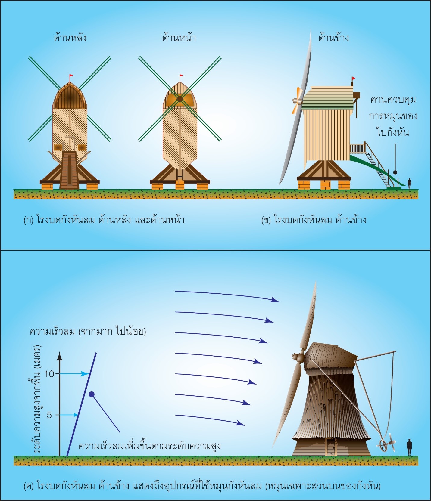 ภาพ 4.4: โรงบดกังหันลม (ก) ด้านหน้า และด้านหลัง (ข) ด้านข้าง และ (ค) ด้านข้าง และอุปกรณ์เพื่อปรับการหมุนของใบพัด เพื่อรับลม และเพื่อหยุดรับลม (ช่วงที่เกิดพายุ)