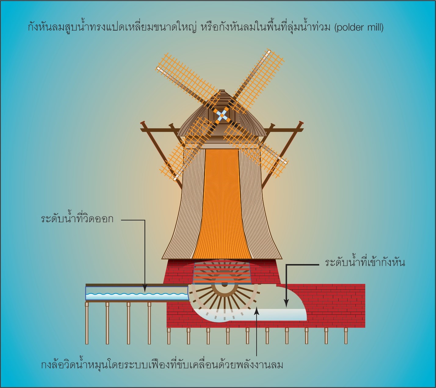 เนื่องจากกังหันลมสูบน้ำ มีความสามารถในการยกระดับน้ำ ให้สูงขึ้นจากระดับเดิม เพียง 1.2 ถึง 1.5 เมตร เท่านั้น การสูบน้ำออกจากพื้นที่น้ำท่วมของชาวดัตซ์ จึงใช้กังหันลมสูบน้ำดังกล่าว เป็นชุด พร้อมกับการขุดคลองระบายน้ำเป็นแนววงแหวน สร้างคันดินสูง และอ่างเก็บน้ำขนาดใหญ่ในพื้นที่สูง ภาพ 4.6 แสดงถึงการสูบน้ำในพื้นที่ต่ำ และยกระดับน้ำ ได้มากกว่า 3.6 เมตร จากระดับเดิม จากชุดกังหันลมสูบน้ำ น้ำที่สูบขึ้นในระดับที่สูงขึ้น จะกักเก็บไว้ในอ่างเก็บน้ำ และระบบคลองชลประทานเพื่อการเกษตร และระบบคลองที่สามารถระบายน้ำลงสู่ทะเล
