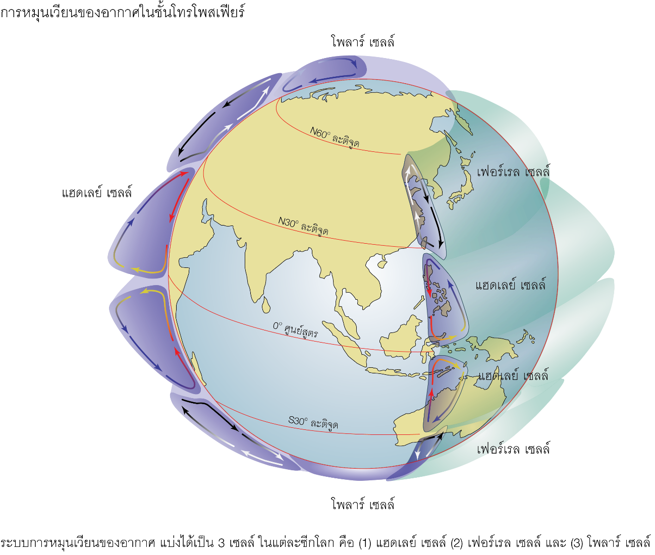 การหมุนเวียนของอากาศในบรรยากาศชั้นโทรโพสเฟียร์ (ชั้นที่ติดกับผิวโลก) เป็นการเคลื่อนที่ของมวลอากาศที่ใหญ่มาก เป็นผลจากการกระจายตัวของพลังงานความร้อนบริเวณผิวโลก การหมุนเวียนของอากาศ ในแต่ละปีไม่เหมือนกัน มีความแปรเปลี่ยน แต่ในภาพหลักจะถือว่ามีรูปแบบที่คงที่ ลักษณะของการหมุนเวียนของอากาศบริเวณผิวโลก สามารถแบ่งได้เป็น 3 เซลล์หลัก คือ แฮดเลย์ เซลล์ (Hadley cell) เฟอร์เรล เซลล์ (Ferrel cell) และโพลาร์ เซลล์ (Polar cell) ซึ่งเกิดทั้งซีกโลกเหนือ และซีกโลกใต้ (ภาพ 3.1) ซึ่งอธิบายได้ดังนี้