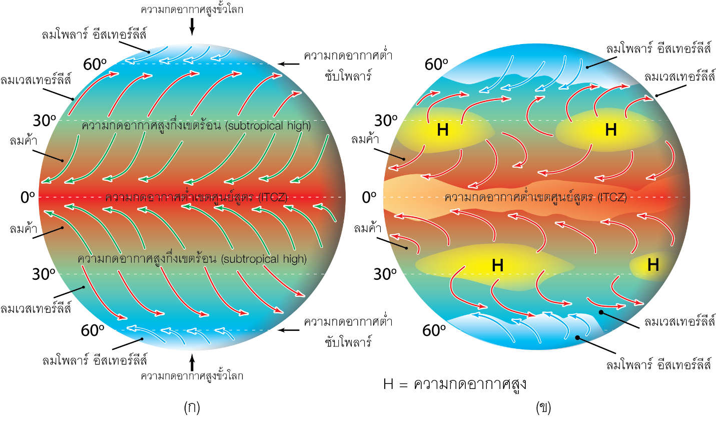 ภาพที่แสดงเกี่ยวกับ ทิศทางการพัด ของ ลมค้า ลมเวสเทอร์ลีส์ ลมอีสเตอร์ลีส์ (ภาพ 3.2 ก) ส่วนมากเป็นภาพในอุดมคติ (ภาพตามแบบจำลอง) บ่อยครั้งที่แสดงพร้อมกับระบบความกดอากาศ ที่มีชื่อต่างๆ (ITCZ, Subtropical high และ Subpolar low ซึ่งจะไม่กล่าวในที่นี้) ในความเป็นจริง (ภาพที่สังเกตได้จากภาพดาวเทียม) ระบบความกดอากาศจะเกิดเป็นกลุ่มก้อน หรือเป็นรูปคล้ายดวงตา (ภาพ 3.2 ข) ลักษณะที่เห็นเป็นกลุ่มก้อนคือก้อนเมฆ (มองจากด้านบน รวมทุกระดับความสูง) ซึ่งมีการแปลความหมาย ว่าเป็นบริเวณที่มีความกดอากาศสูง หรือต่ำ ส่วนทิศทางการพัดของลมหลัก (ลมที่พัด บริเวณที่ติดกับผิวโลก หรือส่วนล่างของโทรไพสเฟียร์) จะเคลื่อนที่หมุนรอบบริเวณที่เกิดเป็นกลุ่มก้อนเหล่านี้