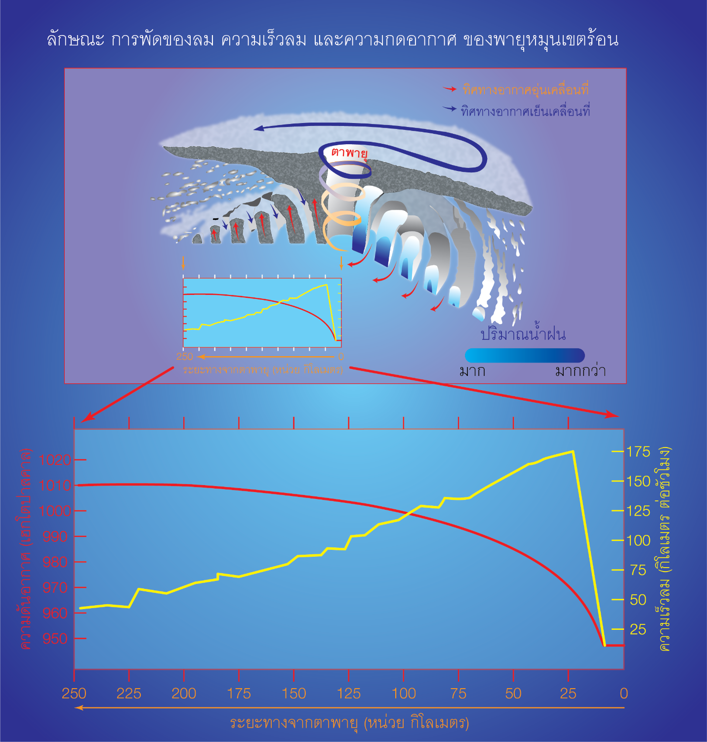 ภาพ 3.3: ลักษณะของพายุหมุนเขตร้อน ภาพตัดขวาง ขนาด ความเร็วลม และความกดอากาศ ของพายุ