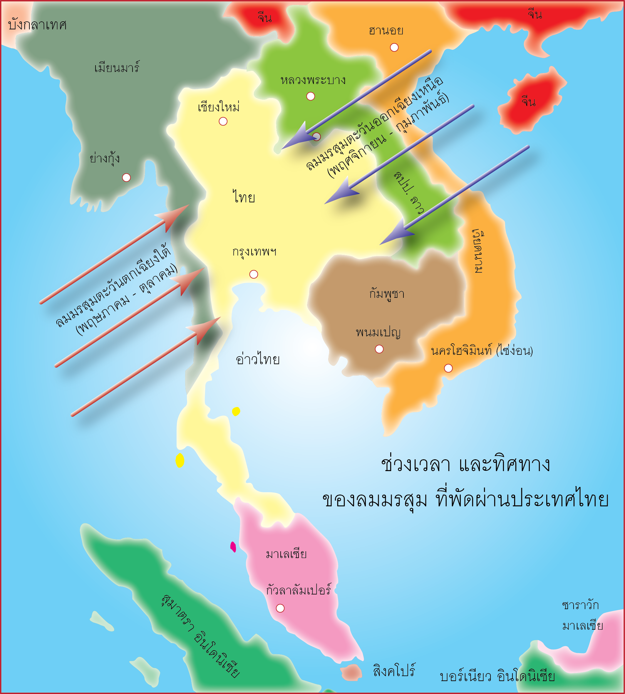 ภาพ 3.5: ลมมรสุม ที่พัดผ่านประเทศไทย ในแต่ละช่วงเวลาของปี หมายเหตุ ทิศที่ใช้เรียกชื่อลม เป็นทิศที่ลมพัดมาจากทิศไหน โดยอ้างอิงกับตำแหน่ง (จุด) ที่ลมพัดผ่าน