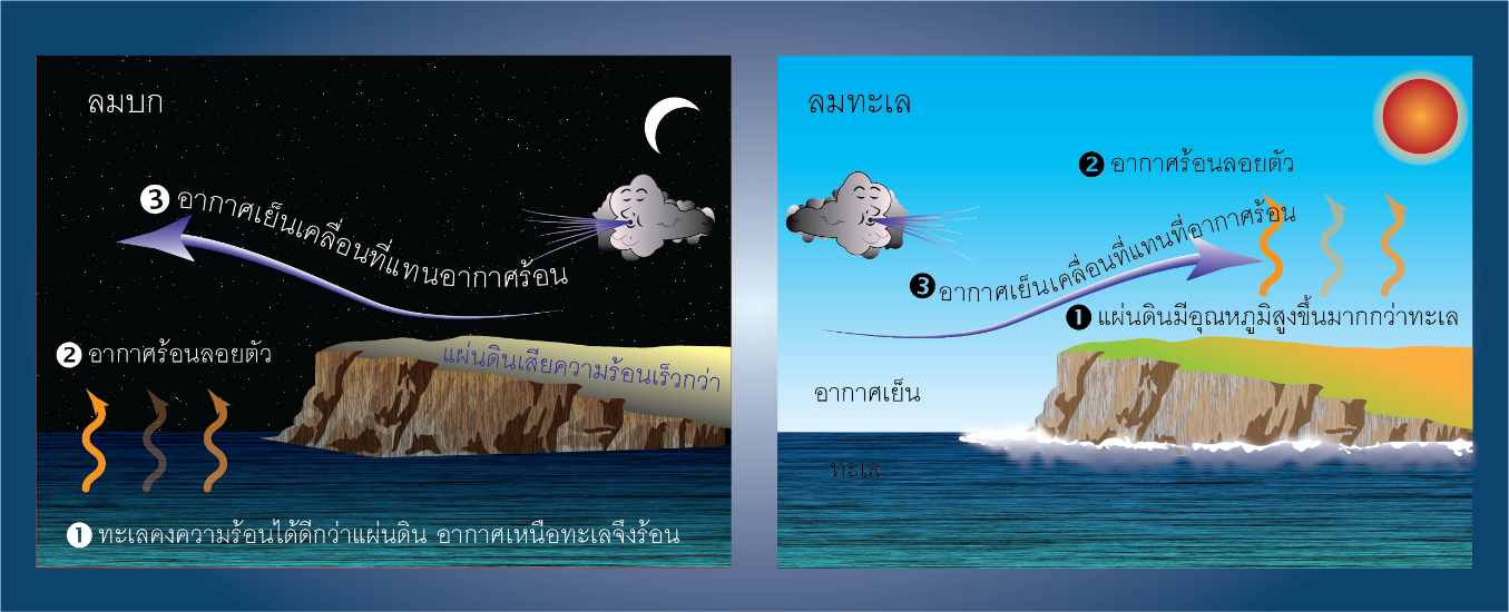 ในช่วงฤดูร้อน (เดือน เมษายน) ของ ชายทะเลฝั่งอ่าวไทย และ (เดือน มกราคม) ของชายทะเลฝั่งอันดามัน ในเวลากลางวัน อุณหภูมิของแผ่นดินเพิ่มขึ้นมากกว่า อุณหภูมิของน้ำทะเล อากาศเหนือแผ่นดินมีความร้อนมากขึ้น ขยายตัว และลอยตัวขึ้น ทำให้อากาศที่อยู่เหนือพื้นทะเลที่เย็นกว่า เคลื่อนที่เข้าหาฝั่ง (ลมทะเล) ลมทะเล อาจพัดเข้าไปในแผ่นดิน หลายกิโลเมตร หรือไม่ถึงกิโลเมตร ทั้งนี้ขึ้นกับความแตกต่างของอุณหภูมิอากาศในช่วงเวลานั้นๆ ในเวลากลางคืน พื้นดินเย็นตัวเร็วกว่าพื้นน้ำ ผลทำให้เกิดลมพัดจากแผ่นดินสู่ทะเล (ลมบก)