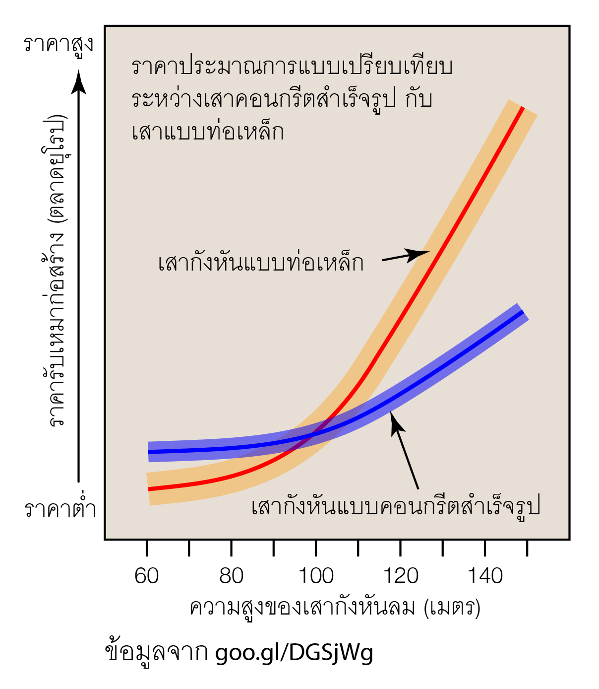 ราคาโดยประมาณแบบแปรียบเทียบ ระหว่างการก่อสร้างเสากังหันลมชิ้นส่วนคอนกรีตสำเร็จรูป กับ เสากังหันลมแบบท่อ (เหล็ก) ทรงกระบอก แสดงให้เห็นถึง ราคาก่อสร้างเสากังหัน (ประมาณ 20 -25 % ของราคาก่อสร้างกังหันลมทั้งหมด) เมื่อเสากังหันลม มีความสูงมากกว่า 100 เมตร ราคาของเสากังหันลม ที่สร้างจากชิ้นส่วนคอนกรีตสำเร็จรูปจะถูกกว่า เสากังหันเหล็กทรงกระบอกอย่างมาก