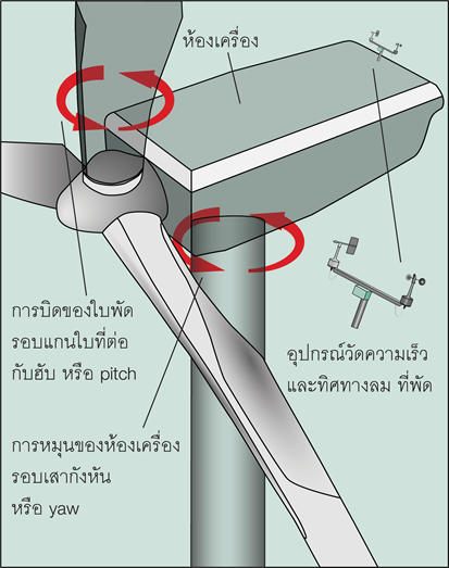 ห้องเครื่อง เป็นส่วนที่ตั้งอยู่บนเสากังหัน และต่อเชื่อมกับโรเตอร์ มีหน้าที่ดังนี้
