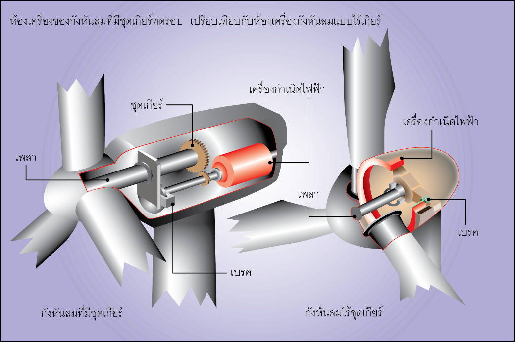 ด้วยเทคโนโลยีในการผลิตกังหันลมเพื่อผลิตไฟฟ้าในปัจจุบัน มีการพัฒนาเร็วมาก และทำให้เกิดระบบการเปลี่ยนพลังงานกล (จากการหมุน) ไปเป็นพลังงานไฟฟ้า มี 2 แบบหลัก คือ ระบบการเพิ่มรอบการหมุนของเพลา โดยใช้ชุดเกียร์ (ระบบกังหันลมที่ใช้กันมากในประเทศ) และระบบที่เปลี่ยนพลังงานโดยตรง ซึ่งระบบนี้เป็นระบบใหม่ ไม่ใช้ชุดเกียร์ (ภาพ 5.4) ระบบกังหันลมในการผลิตไฟฟ้า ที่ไม่ใช้ชุดเกียร์ เป็นระบบทางเลือกอีกทางในการล่าลม เพื่อใช้ผลิตไฟฟ้า (ทั้งสองระบบ มีข้อเด่น และข้อด้อยต่างกัน การเลือกใช้ขึ้นกับสภาพลมของพื้นที่ และความพอใจของเจ้าของโครงการ)