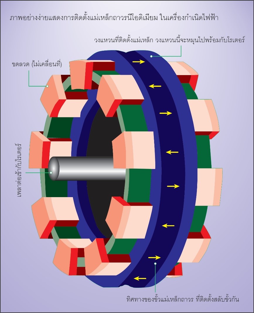 ภาพ 5.5: การผลิตไฟฟ้าของกังหันลมไร้เกียร์ โดยชุดของแม่เหล็กนีโอดิเมียม จะหมุนไปพร้อมกับเพลาที่ต่อจากกังหันลม โดยมีขดลวดซึ่งอยู่กับที่ ผลที่ได้คือจะเกิดไฟฟ้ากระแสสลับ