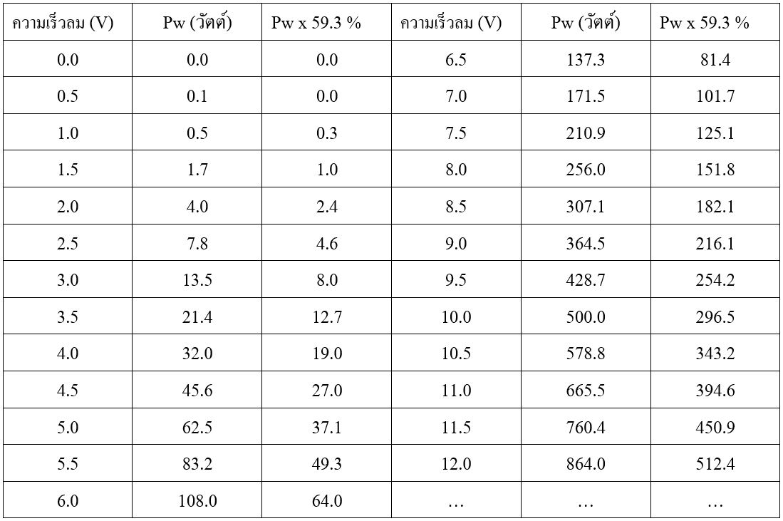 ตาราง 6.1: ความเร็วลม และพลังงานลม คำนวณจาก สมการที่ (3) เปรียบเทียบกับพลังงานมากสุดที่กังหันลมสามารถเปลี่ยนถ่ายพลังงานได้ ตามกฎของเบตซ์ หรือค่าจำกัดของเบ็ตซ์ (Betz limit) ที่มีค่า 59.3 %