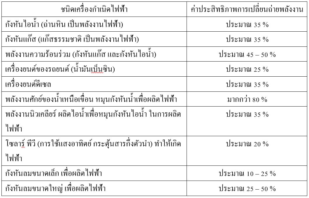 ตาราง 6.2: รายการค่าประสิทธิภาพการเปลี่ยนถ่ายพลังงาน ของเครื่องกำเนิดไฟฟ้าประเภทต่างๆ
