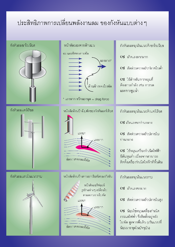 ในบทที่ 4 (ภาพ 4.8) และบทที่ 5 ได้กล่าวถึงประเภทของกังหันแกนหมุนในแนวราบ และกังหันลมแกนหมุนในแนวดิ่ง ในการทดลองและศึกษา รูปแบบกังหันพบว่า ลักษณะของใบกังหันลม เป็นปัจจัยที่สำคัญ ในการเพิ่มประสิทธิภาพของกังหันลม ภาพ ที่ 6.2 แสดงถึงประเภทของกังหันลม ประเภทของแรงที่เกิดขึ้นกับใบกังหัน และตัวอย่างการนำแรงดังกล่าวไปใช้ประโยชน์