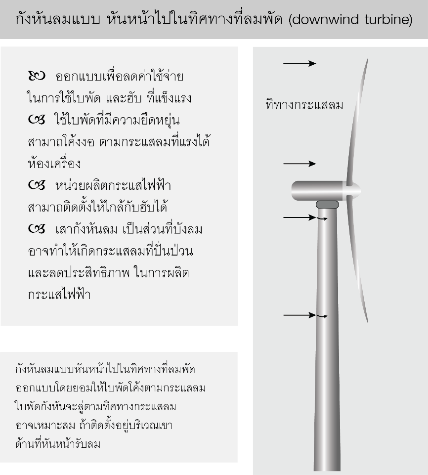 โดยทั่วไปกังหันลมแกนหมุนในแนวราบที่ผลิตไฟฟ้า มักจะหันหน้าเข้าหาลม เพื่อให้ได้รับลมได้อย่างเต็มที่ แต่บางครั้งมีการออกแบบกังหันลมให้หันหลังเข้าหาทิศทางลม ยอมให้บางส่วนของพลังงานสูญเสีย โดยมีห้องเครื่อง และเสากังหัน กั้นลมเป็นบางส่วน (ภาพ 6.4) กังหันลมที่หันหลังเข้าหาลม หรือกังหันลมที่หันหน้าไปทางเดียวกับทิศทางลม เหมาะสมกับกังหันลมที่ตั้งอยู่บริเวณหน้าภูเขาประทะกับทิศทางลม