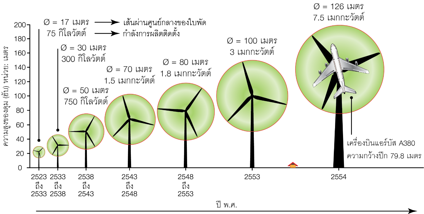 ตั้งแต่ ปี พ.ศ. 2523 เป็นต้นมา ขนาดของกังหันลมสำหรับผลิตไฟฟ้า เริ่มที่ความสูงกังหัน (ความสูงของดุมใบพัด (ฮับ) 17 เมตร และผลิตไฟฟ้าได้ ต้นละ 75 กิโลวัตต์ ซึ่งผ่านมา 31 ปี (พ.ศ. 2554) ความสูงของดุมใบพัด เพิ่มเป็น 126 เมตร และผลิตไฟฟ้าได้ ต้นละ 7.5 เมกกะวัตต์ (1,000 เท่า) ภาพ 6.7 แสดงถึงการเพิ่มขนาดของกังหันลม โดยมีความสูงเพิ่มขึ้น พื้นที่กวาดลมของใบพัดพัดมากขึ้น และกำลังการผลิตของต้นกังหันสูงขึ้น