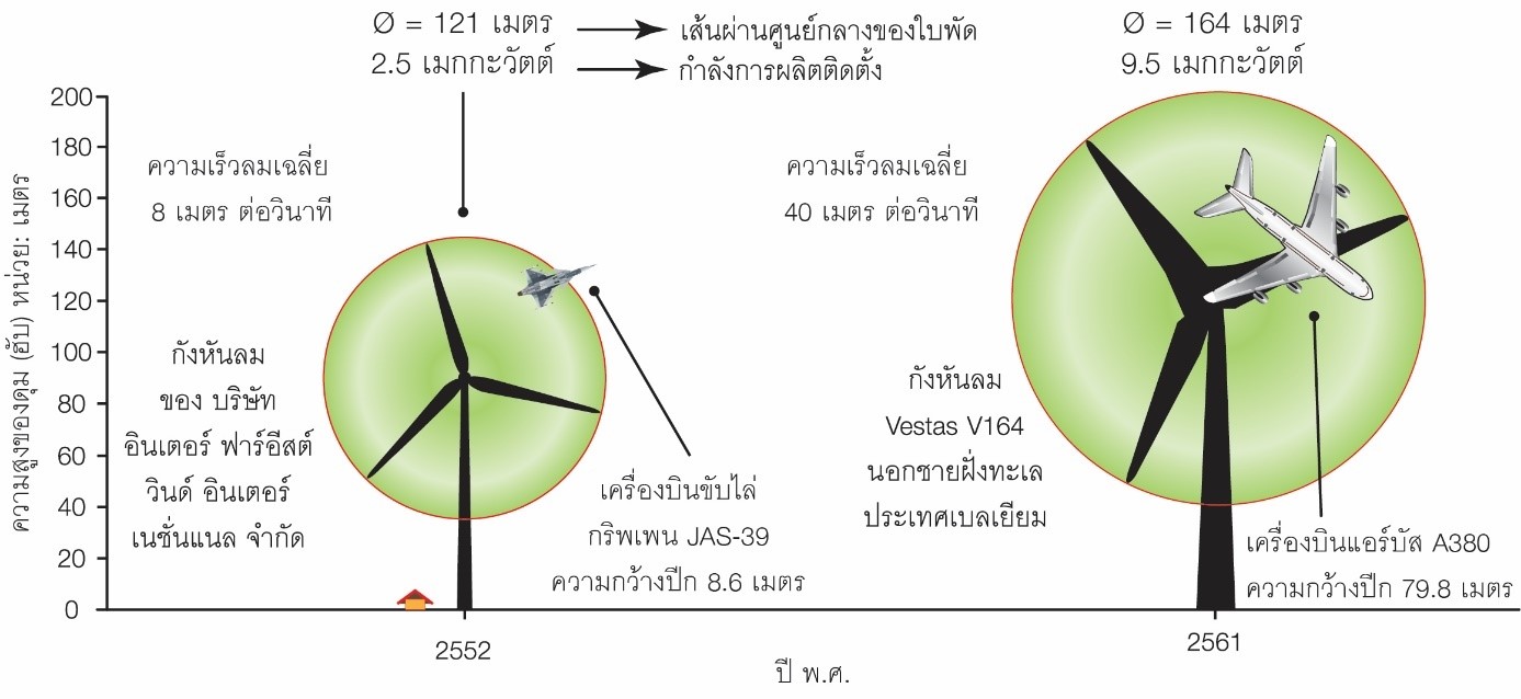 ในปี พ.ศ. 2557 กังหันลมชื่อ “Vestas V164” ชื่อรุ่นของบริษัทผู้ผลิต ติดตั้งบริเวณนอกชายฝั่งทะเล ประเทศเบลเยียมได้ปรับปรุง จากเดิม กำลังการผลิตติดตั้ง 8 เมกกะวัตต์ ต่อ 1 ต้น ให้มีกำลังการผลิต 9.5 เมกกะวัตต์ ต่อ 1 ต้น ซึ่งในปัจจุบัน (พ.ศ. 2561) จัดว่าเป็นกังหันลมผลิตไฟฟ้าขนาดใหญ่ที่สุด และมีกำลังการผลิตมากที่สุดในโลก ภาพ 6.7 เปรียบเทียบระหว่าง “Vestas V164” ในด้าน ขนาด และกำลังการผลิตของกังหันลมขนาดใหญ่ที่สุด และกำลังการผลิตมากสุดของประเทศไทย (บริษัท อินเตอร์ ฟาร์อีสท์ วินด์ อินเตอร์เนชั่นแนล จำกัด)
