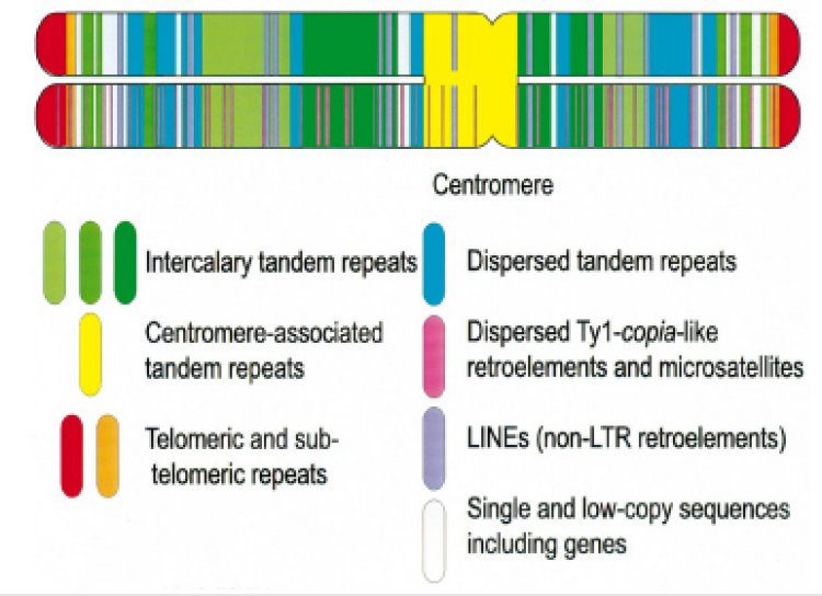 2.Repetitive DNAมีอยู่ประมาณ 25% ของ DNA ในจีโนม เป็น DNA ที่มีการเรียงตัวของเบสซ้ำๆ กัน แบ่งได้เป็น 2 ประเภท คือ