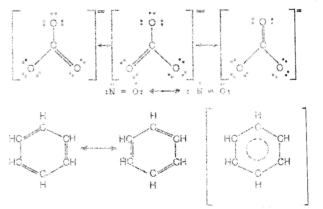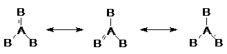 เส้นตรงหนึ่งเส้นแทนพันธะเดี่ยวระหว่าง A กับ B และเส้นตรงสองเส้นหรือเส้นคู่แทนพันธะคู่ระหว่าง A กับ B แต่จากากรทดลองพบว่าความยาวพันธะระหว่าง A กับ B เท่ากันทุกพันธะ และมุมพันธะระหว่าง B-A-B ดังนั้นสูตรโครงสร้างที่แท้จริงจึงไม่ใช่สูตรหนึ่งแต่จะเป็นโครงสร้างผสมระหว่างทั้งสามแบบ ดังนี้