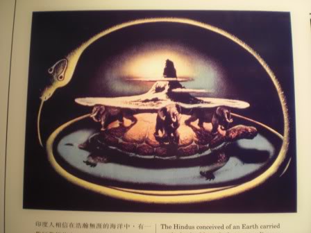 โลกของเราเป็นครึ่งทรงกลมวางอยู่บนช้างทั้งสี่ (ไม่รู้ว่ามีใครเลี้ยงไว้หรือเปล่า เลยไม่รู้จะเรียกช้างเหล่านี้เป็นเชือกหรือเป็นตัวดี) โดยมีเต่าขนาดใหญ่มาก รองรับช้างทั้งหมดไว้ และยังมีงู (กินหาง) ขดตัวเองรองเต่าไว้อีกที ดังรูปที่ 1