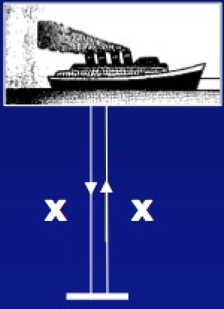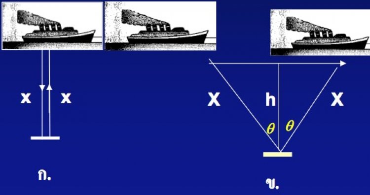 หมายเหตุ การคำนวณความลึกตามสถานการณ์ในรูป ข. ต้องคำนวณระยะทางที่เรือเคลื่อนที่ประกอบด้วย