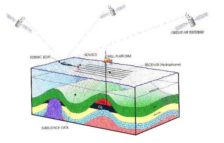 3. เรือสำรวจแล่นด้วยความเร็วคงที่ตามแนวที่กำหนดไว้ (ส่วนใหญ่จะอยู่ในแนวทิศตะวันออก-ตะวันตก และทิศเหนือ-ใต้) อุปกรณ์ต้นกำเนิดคลื่นเสียงจะส่งสัญญาณคลื่นทุก 5-10 วินาที ผ่านน้ำทะเลลงไปสู่ชั้นดิน-หินใต้พื้นทะเล และสะท้อนกลับมา สู่ตัวรับสัญญาณ