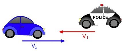 ถ้า 1= 20 m/s และ 2= 20 m/s เท่ากัน ความเร็วสัมพัทธ์ของ (2) เทียบกับ (1) หรือ 21= 20 - (-20) = 40 m/s หรือแปลว่า (1) จะเห็น (2) เคลื่อนที่ด้วยความเร็ว 40 m/s สวนทางไป