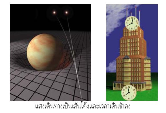 - เมื่อแรงโน้มถ่วงทำให้แสงโค้ง แสงจะเดินทางช้าลง
