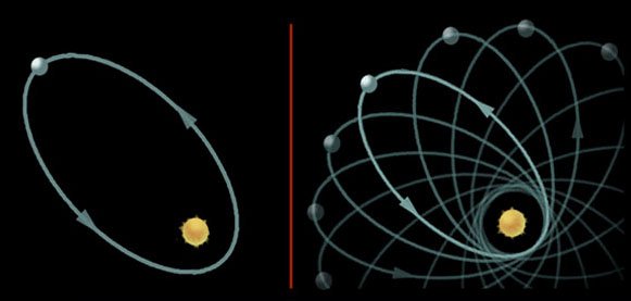 ในปี ค.ศ. 1843 Le Verrier นักดาราศาสตร์ชาวฝรั่งเศส ได้ค้นพบว่าวงโคจรของดาวพุธนั้นไม่ได้เป็นวงรีที่ตายตัวแต่จะมีการหมุนควงไป 574 พิลิปดา ทุก ๆ 100 ปี การหมุนควงนี้อาจจะเกิดขึ้นเพราะการดึงดูดจากดาวเคราะห์ดวงอื่น ๆ นอกจากดวงอาทิตย์ Le Verrier ได้ใช้กฎของนิวตันคำนวณถึงผลจากการดึงดูดจากดาวเคราะห์ต่าง ๆ ผลการคำนวณได้ว่า วงโคจรของดาวพุธจะหมุนควงไป 531 พิลิปดาในเวลา 100 ปี ซึ่งผิดไปจากค่าที่สังเกตได้อยู่ 43 พิลิปดา ค่าที่ผิดพลาดนี้ไม่มีใครอธิบายได้ว่าทำไม จนกระทั่งไอน์สไตน์ได้ใช้ทฤษฎีสัมพัทธภาพทั่วไปของเขาคำนวณวงโคจรของดาวพุธในปี ค.ศ. 1915 และพบว่าผลจากการโค้งงอของปริภูมิเวลาจะทำให้วงโคจรของดาวพุธหมุนควงเพิ่มขึ้นอีก 43 พิลิปดาซึ่งตรงกับค่าที่สังเกตได้พอดี