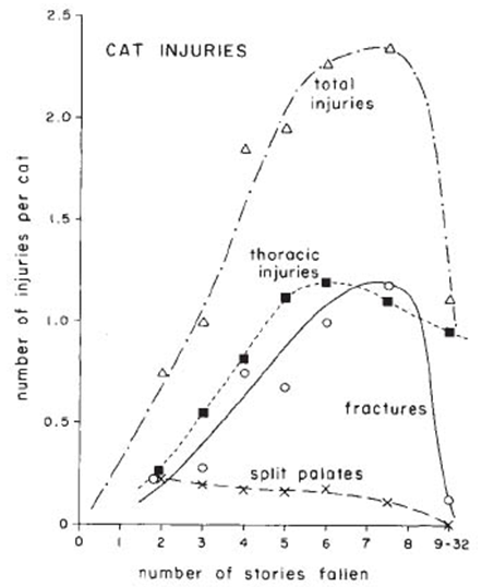สรุปได้ว่า เมื่อแมวตกจากตึกสูงมากๆ จะไม่บาดเจ็บมากนักเพราะมีเวลาเหลือเฟือในการจัดระเบียบร่างกาย เช่นเดียวกับเมื่อตกจากที่ที่ไม่สูงมากนัก (ชั้น 2-3) ความเร็วขณะตกถึงพื้นนั้นยังต่ำกว่าความเร็วปลายค่อนข้างมาก แม้จะพลิกตัวไม่ทัน หรือจัดระเบียบร่างกายได้ไม่สมบูรณ์ ก็ยังไม่บาดเจ็บมากนัก ในขณะที่ความสูงระดับกลางๆ (ชั้น 4 - 9) ความเร็วในการตกอยู่ในระดับที่ทำให้แมวบาดเจ็บรุนแรงได้หากลงด้วยท่าทางที่ไม่ถูกต้อง แต่ระยะเวลาที่ตกจากระดับความสูงนี้ (ชั้น 4 - 9) ก็สั้นเกินกว่าที่แมวจะจัดท่าทางให้สมบูรณ์ได้ทัน แมวจึงมีอัตราการตายและบาดเจ็บสูงสุดที่ช่วงความสูงกลาง ๆ