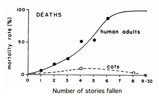 ส่วนในอีกสถานการณ์หนึ่งเมื่อมนุษย์ตกลงมาจากตึกสูง อัตราการตายจะสูงกว่าแมวมาก ตาย / ความสูงความสัมพันธ์สาเหตุที่แตกต่างกันของการเสียชีวิต สาเหตุหลักของการเสียชีวิตมีการบาดเจ็บที่ศีรษะและเลือดออกจากการบาดเจ็บที่อวัยวะภายใน