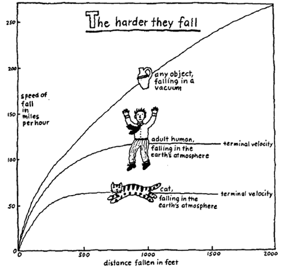 สำหรับแมวซึ่งถือว่ามีน้ำหนักค่อนข้างน้อยจึงสามารถตกจากที่สูงได้มากกว่าคนโดยไม่ตาย แต่หากปล่อยแมวจากที่สูงมากๆ จนทำให้ความเร็วตอนที่กระทบพื้นสูงมากพอก็น่าจะทำให้เกิดแรงกระแทกที่ฆ่าแมวได้ แต่จากผลการศึกษาของ Jared Diamond แมวยิ่งตกจากที่สูงกลับมีโอกาสตายน้อยลง ทำไมจึงเป็นเช่นนั้น?