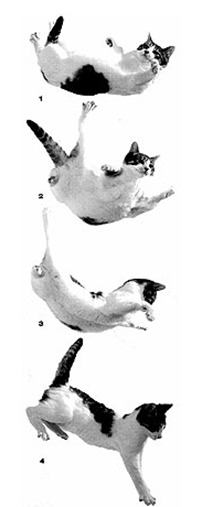 สุภาษิตที่มีชื่อเสียงว่าแมวมีเก้ชีวิตเกิดในส่วนหนึ่งจากความสามารถของพวกเขาเพื่อความอยู่รอด ในสถานการณ์เช่นการตกจากที่สูงซึ่งมนุษย์ส่วนใหญ่มักจะไม่มีทางรอดชีวิต แต่แมวกลับสามารถรอดมาได้อย่างปาฎิหาร ซึ่งมีนักวิทยาศาสตร์หลายท่านให้ความสนใจและทำการศึกษาอย่างลึกซึ้ง ว่ากฎทางฟิสิกส์ข้อใดที่จะนำมาอธิบายปรากฎการณ์เหล่านี้ได้ในปี 2532 สัตวแพทย์แห่งโรงพยาบาลสัตว์ในมหานครนิวยอร์กชื่อ Jared Diamond ได้ทำการศึกษาข้อมูลทางสถิติของการตกจากตึกของแมว เพื่อสร้างฐานข้อมูลจาก 132 เหตุการณ์ ที่แมวได้รับบาดเจ็บจากการตกจากตึกสูงตั้งแต่ 2 ชั้นขึ้นไป จนถึง 32 ชั้น โดยมีค่าเฉลี่ยของจำนวนชั้นที่ 5.5 ชั้น แต่ละชั้นมีความสูงเฉลี่ยที่ 15 ฟุต แมวส่วนใหญ่จะตกลงบนพื้นคอนกรีตแข็ง ในจำนวนนี้มีแมวที่ได้รับการรักษา 115 ตัว นอกจากนั้นเป็นแมวที่เจ้าของขอปฎิเสธการรักษา พบว่ามีแมวเพียง 11 ตัวที่ตายจากการตกจากที่สูง นับว่ามีอัตราการรอดชีวิตถึง 90% แมวที่ตายส่วนใหญ่ตกลงมาจากชั้น 7 และที่ได้รับบาดเจ็บค่อนข้างมาก ส่วนใหญ่ตกลงมาจากชั้น 4-9 ในขณะที่แมวที่ตกมาจากชั้นสูงๆ (20-32) กลับได้รับบาดเจ็บน้อยกว่า ซึ่งถือเป็นเรื่องที่คาดไม่ถึง