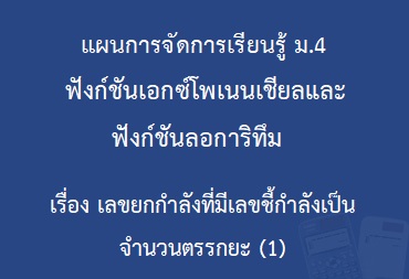 แผนการจัดการเรียนรู้ ฟังก์ชันเอกซ์โพเนนเชียลและฟังก์ชันลอการิทึม : เรื่องเลขยกกำลังที่มีเลขชี้กำลังเป็นจำนวนตรรกยะ (1) ระดับชั้นมัธยมศึกษาปีที่ 4 ผลิตขึ้นเพื่อให้ครูในโรงเรียนทั่วประเทศได้ใช้ประกอบการสอนวิชาคณิตศาสตร์โดยใช้เครื่องคำนวณวิทยาศาสตร์โดยมีวัตถุประสงค์การเรียนรู้ ได้แก่