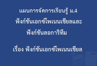 แผนการจัดการเรียนรู้ ฟังก์ชันเอกซ์โพเนนเชียลและฟังก์ชันลอการิทึม : เรื่อง ฟังก์ชันเอกซ์โพเนนเชียล ระดับชั้นมัธยมศึกษาปีที่ 4 ผลิตขึ้นเพื่อให้ครูในโรงเรียนทั่วประเทศได้ใช้ประกอบการสอนวิชาคณิตศาสตร์โดยใช้เครื่องคำนวณวิทยาศาสตร์ มีวัตถุประสงค์เพื่อให้เข้าใจลักษณะกราฟของฟังก์ชันเอกซ์โพเนนเชียล และนำไปใช้ในการแก้ปัญหาได้ รวมถึงมีเจตคติที่ดีต่อคณิตศาสตร์มากขึ้น และนักเรียนสามารถนำความรู้ไปต่อยอดในระดับมหาวิทยาลัยได้ต่อไป