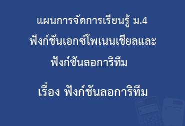 แผนการจัดการเรียนรู้ ฟังก์ชันเอกซ์โพเนนเชียลและฟังก์ชันลอการิทึม : เรื่อง ฟังก์ชันลอการิทึม ระดับชั้นมัธยมศึกษาปีที่ 4 ผลิตขึ้นเพื่อให้ครูในโรงเรียนทั่วประเทศได้ใช้ประกอบการสอนวิชาคณิตศาสตร์โดยใช้เครื่องคำนวณวิทยาศาสตร์ ให้นักเรียนเข้าใจลักษณะกราฟของฟังก์ชันลอการิทึม และนำไปใช้ในการแก้ปัญหา รวมถึงมีเจตคติที่ดีต่อคณิตศาสตร์มากขึ้น และนักเรียนสามารถนำความรู้ไปต่อยอดในระดับมหาวิทยาลัยได้ต่อไป