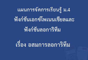 แผนการจัดการเรียนรู้ ฟังก์ชันเอกซ์โพเนนเชียลและฟังก์ชันลอการิทึม : เรื่อง อสมการลอการิทึม ระดับชั้นมัธยมศึกษาปีที่ 4 ผลิตขึ้นเพื่อให้ครูในโรงเรียนทั่วประเทศได้ใช้ประกอบการสอนวิชาคณิตศาสตร์โดยใช้เครื่องคำนวณวิทยาศาสตร์ ให้นักเรียนเข้าใจอสมการลอการิทึม (logarithmic inequality) เป็นอสมการที่มีลอการิทึมของตัวแปร การแก้อสมการอาจทำได้โดยอาศัยสมบัติต่าง ๆ ของลอการิทึม ข้อควรระวังคือตัวแปรที่อยู่ภายใต้ลอการิทึมจะต้องมีค่ามากกว่าศูนย์เสมอ รวมถึงมีเจตคติที่ดีต่อคณิตศาสตร์มากขึ้น และนักเรียนสามารถนำความรู้ไปต่อยอดในระดับมหาวิทยาลัยได้ต่อไป