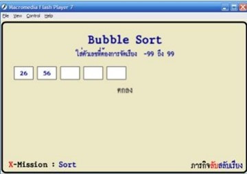 ภารกิจลับสลับเรียง เป็นสื่อบทเรียนสำหรับระบบการเรียนรู้ออนไลน์ ที่ผู้เรียนสามารถเรียนผ่านระบบการเรียนรู้ออนไลน์ หรือ เรียนแบบออฟไลน์ได้ ซึ่งได้มีการจัดแบ่งเนื้อหาออกเป็นตอนเพื่อให้ผู้เรียนสามารถเลือกเรียนตามเนื้อหาที่สนใจได้ ภารกิจลับสลับเรียง เป็นบทเรียนที่มีเนื้อหาเกี่ยวกับการเรียงลำดับในวิชาคอมพิวเตอร์ ซึ่งมีรูปแบบที่หลากหลายทั้ง ภาพเคลื่อนไหว , ไฟล์เอกสาร และ การปฏิสัมพันธ์กับผู้เรียน ภารกิจลับสลับเรียง ใช้โปรแกรม Macromedia Flash MX 2004 ในการพัฒนาสื่อการเรียนรู้ทั้งการสร้างภาพเคลื่อนไหวและการเขียนคำสั่งควบคุมโดยใช้ภาษา ActionScript , PhotoShop CS สำหรับการตกแต่งรูปภาพประกอบ และ Sony Acid pro 6.0 สำหรับบันทึกและตัดต่อเสียงประกอบ X-Mission : Sort is CAI about data sorting that students can learn online and offline. X-Mission : Sort has 3 Part . Part 1 is animation , Part 2 is simulation , Part 3 is interactive question. X-Mission : Sort is developed by Macromedia Flash MX 2004 , PhotoShop CS and Sony Acid pro 6.0